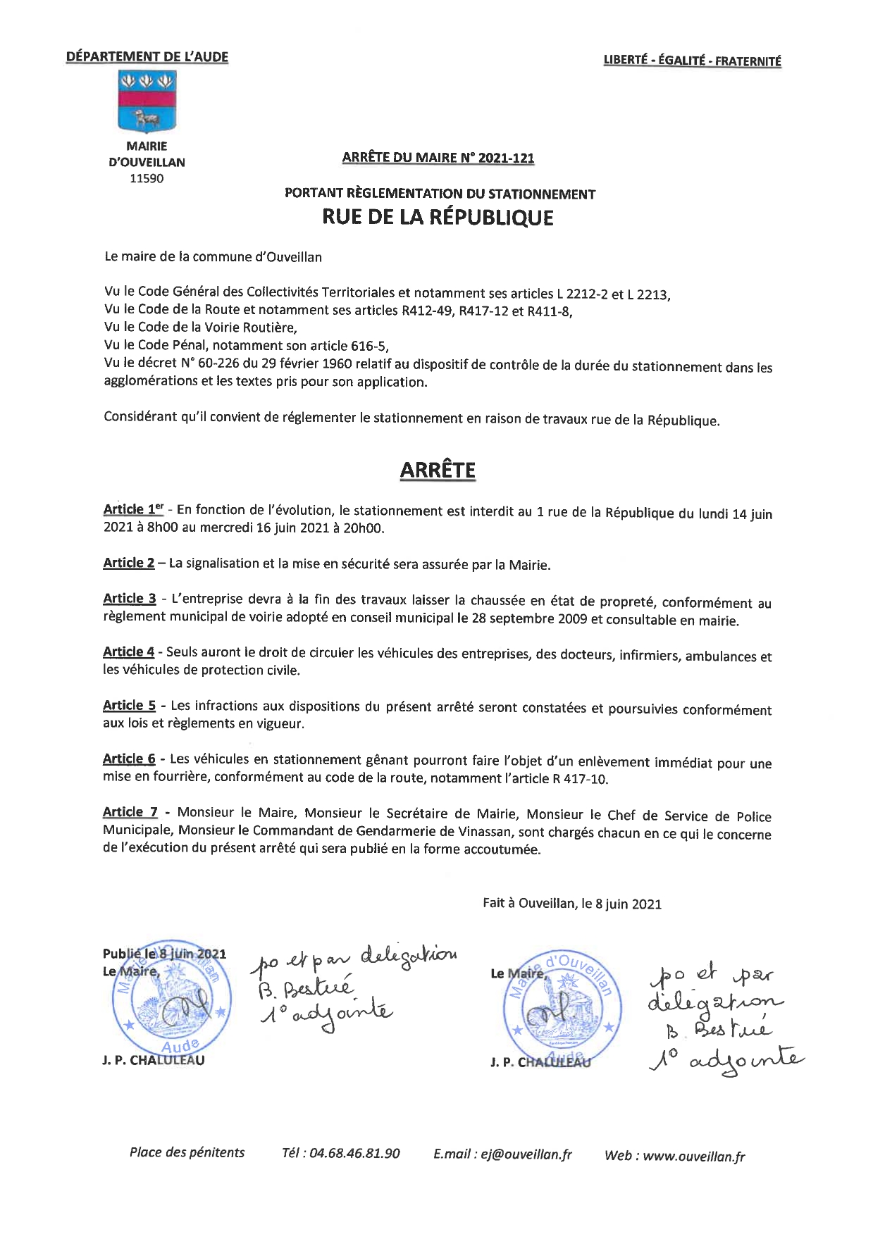 Arrêté « Rue de la République » du 08/06/21 n°2021-121 Laisser un commentaire / Actualités, Arrêté, Travaux, Vie municipale, Vie quotidienne / Par Arrêté « Rue de la République » du 08/06/21 n°2021-121 1 fichier·s 65.69 KB Télécharger