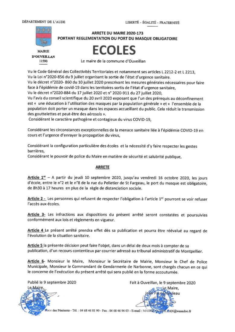 Un élève du CP de l’école primaire d’Ouveillan a été testé positif à la Covid19. Aussitôt, le cas a été déclaré auprès de la Médecine Scolaire, qui a donné ses premières préconisations. Dans un 1er temps, elle a envisagé la fermeture de 3 classes, en attendant l’avis de Agence Régionale de Santé (ARS).