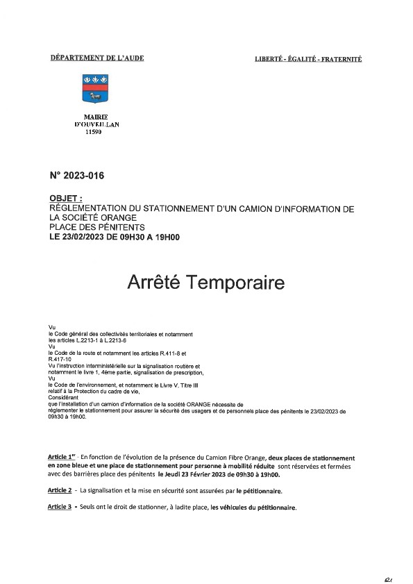 Arrêté «Camion Orange» du 06/02/23 n°2023-016 Actualités, Arrêté / 19/02/2023 / Arrêté municipal, Circulation Arrêté «Camion Orange» du 06/02/23 n°2023-016 Lire la suite »