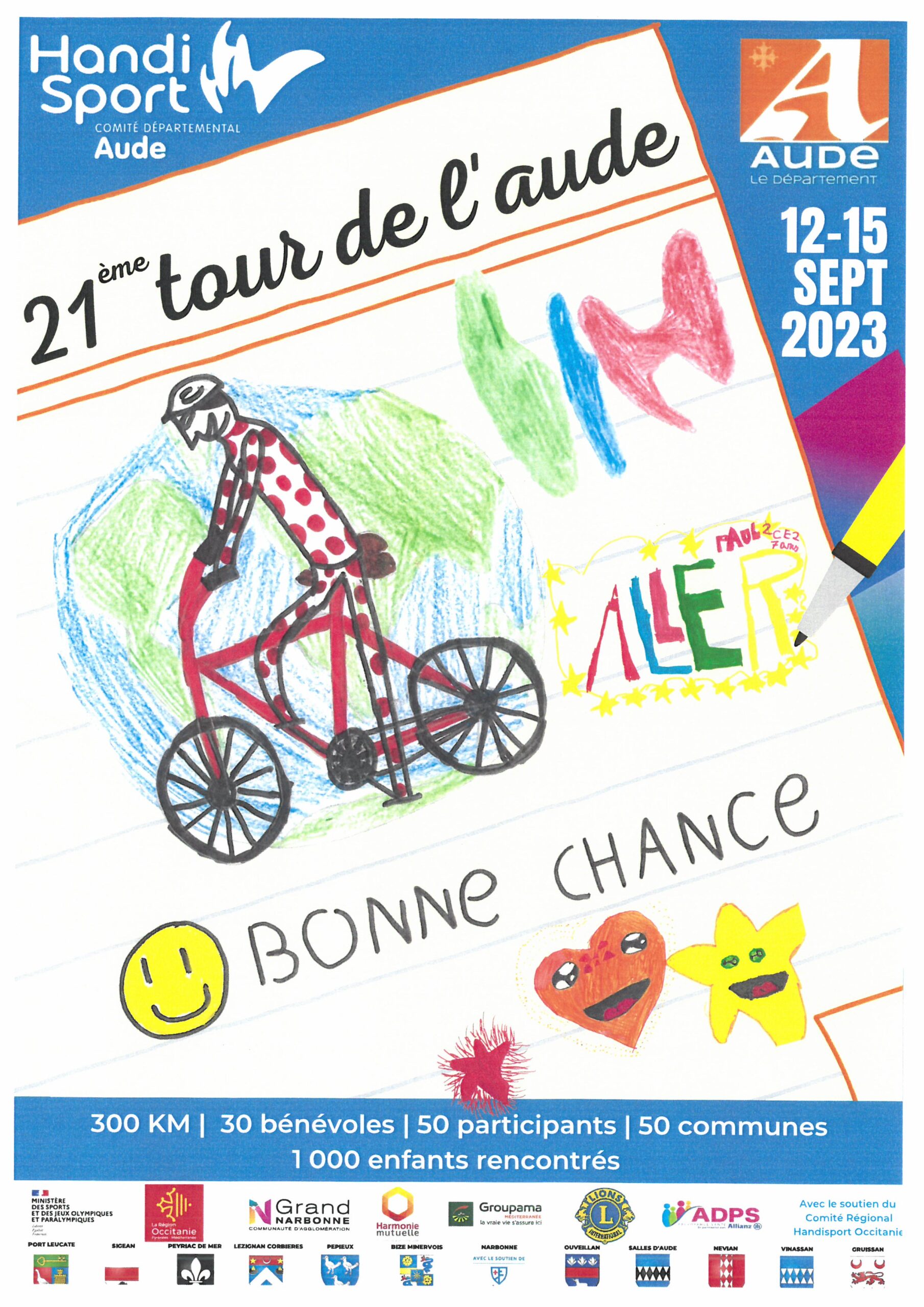 Long de 250 kilomètres, ce Tour est l’occasion pour tous les participants de partir à la découverte du département de l’Aude, mais aussi de découvrir les spécificités d’une pratique sportive pour les personnes handicapées. Tandem, Handbike, Vélo ou Tricycle, ce Tour est ouvert à tous. La dimension compétitive est mise au second plan pour laisser la place à la transmission et la sensibilisation. En effet, la caravane du Tour et ses coureurs font halte dans la plupart de villes et villages traversées pour aller à la rencontre des écoliers. Ces arrêts permettent des temps d’échanges entre les sportifs, les élèves et leurs professeurs autour de la thématique du handicap et du handisport.