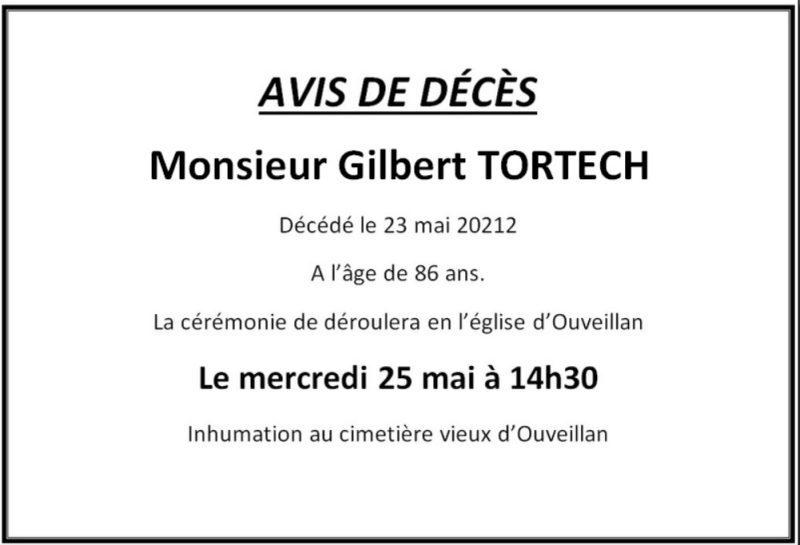 Avis de décès M. Gilbert TORTECH Actualités, Avis de décès / 23/05/2022 / avis de décès Monsieur le Maire et le Conseil Municipal présentent leurs sincères condoléances à la famille. Avis de décès M. Gilbert TORTECH Lire la suite »