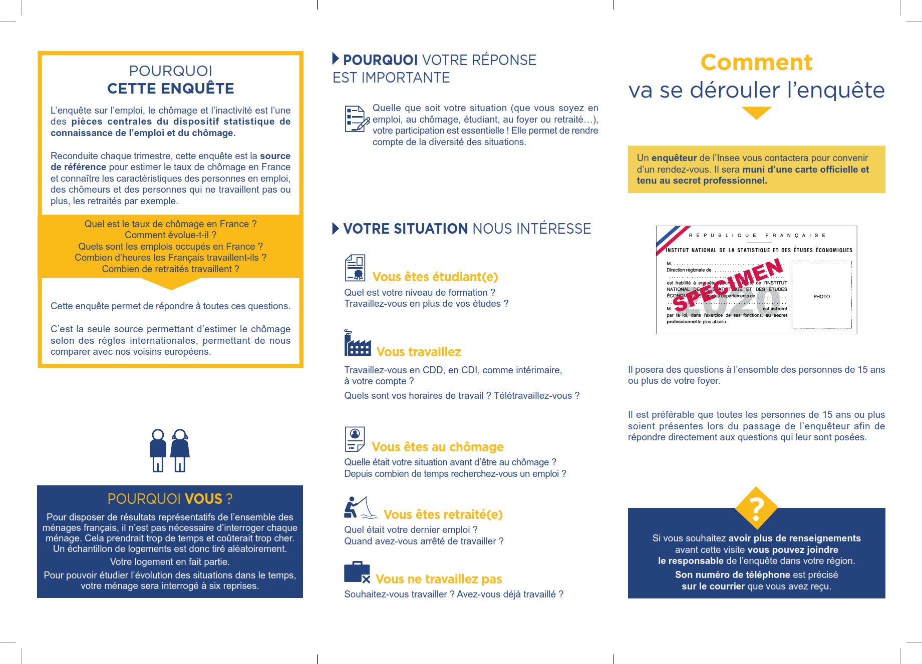 Cette enquête permet de déterminer combien de personnes ont un emploi, sont au chômage ou ne travaillent pas (étudiants, retraités…). Elle est la seule source permettant de nous comparer avec nos voisins européens. Elle fournit également des données originales sur les professions, l’activité des femmes ou des jeunes, les conditions d’emploi ou la formation continue.