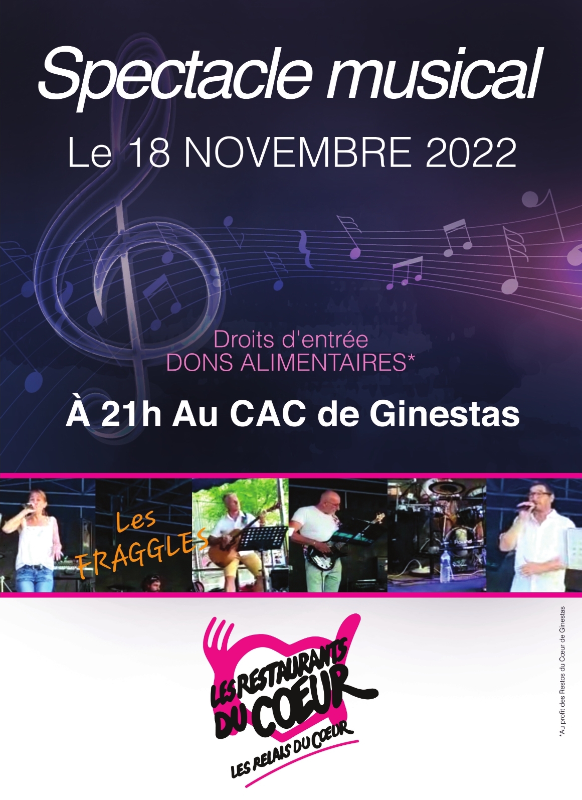 Après deux ans et demi d’interruption …due à la crise sanitaire, l’équipe de bénévoles des Restos du Cœur de Ginestas organise une soirée musicale au C.A.C de Ginestas vendredi 18 novembre à 21h.