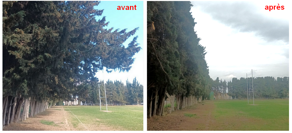 A la demande des dirigeants de L’AOCS, une taille des cyprès se révélait nécessaire afin de préserver la sécurité des joueurs et des spectateurs. C’est pourquoi l’entreprise J&R paysagiste a été sollicitée pour prendre en charge cette mission délicate.